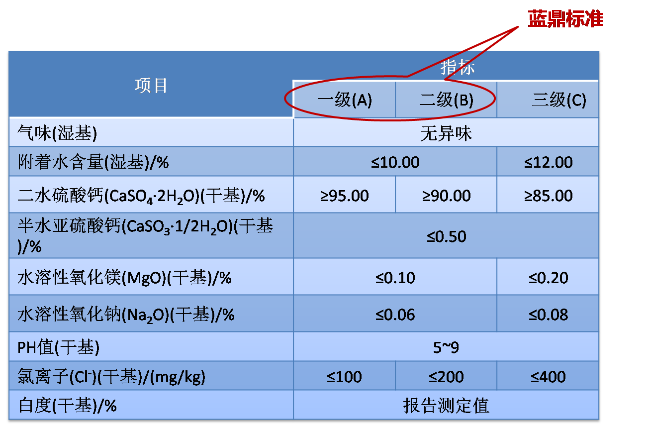 烟气脱硫石膏是电厂、钢铁厂采用石灰石-石膏湿法脱硫工艺产生的副产物,其质量高低主要取决于脱硫剂石灰石的品位和脱硫工段的运行管理。我司使用的脱硫剂石灰石品位高、烟气脱硫过程指标控制稳定、脱硫和石膏浆液脱水系统运行管理可靠,因此更容易实现对副产脱硫石膏的质量控制,脱硫石膏中二水硫酸钙含量高达95%以上,CI-100mg/L以下,远高于天然石膏和磷石膏。