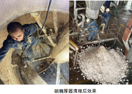威远蓝鼎副总经理黄安军要求检修过程中人员安全为首位,对生产检修工作进行细化,生产副部长杨平负责带领生产班组员工启机前完成稠厚器积料清理,稠厚器内部温度接近35°,考虑人员安全,生产班组人员分批轮流下去清理,两人在下方疏通,8月1日12:58分在生产检修班组共同协作下清理稠厚器积料6吨,8月1日18:00蒸发浓缩检修工作提前完成,8月1日晚上23点蒸发浓缩顺利启机恢复生产,通过本次停机检修提升了团队默契协作,增强了各部门的紧密协作关系和生产班组团队凝聚力。
