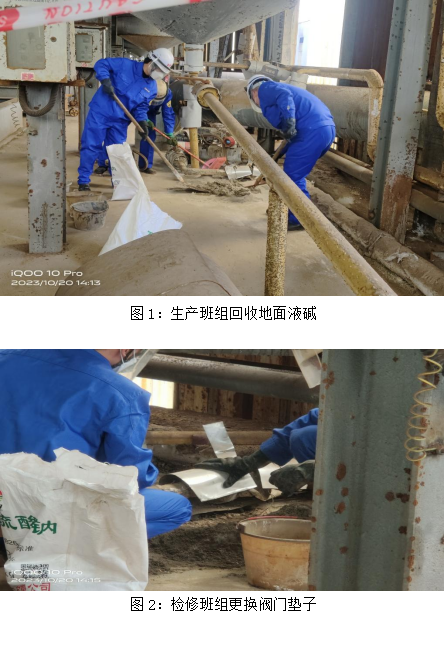 本次演练内容是二次除矾液碱管道泄漏。14:00当班两名反应釜岗位工加碱时发现液碱阀门渗漏,现场人员立即通知当班班长,班长立即组织人员准备急救物资,14:02当班班长赶到现场查看渗漏情况后立即组织人员用应急沙进行围堵并安排人员拉好警戒线维持好现场秩序;14:03当班班长将情况汇报调度室同时通知检修到场,调度室第一时间通知安全环保科;14:05检修到现场确认情况并制定检修方案,同时现场监护人员确认检修防护用品是否穿戴完整;14:15经过检修抢修后现场试车确认,无渗漏,汇报相关领导同时把地面污染物进行清理;14:25经过相关领导确认后,无渗漏,同意恢复生产;14:28汇报调度,调度室通知恢复正常生产。