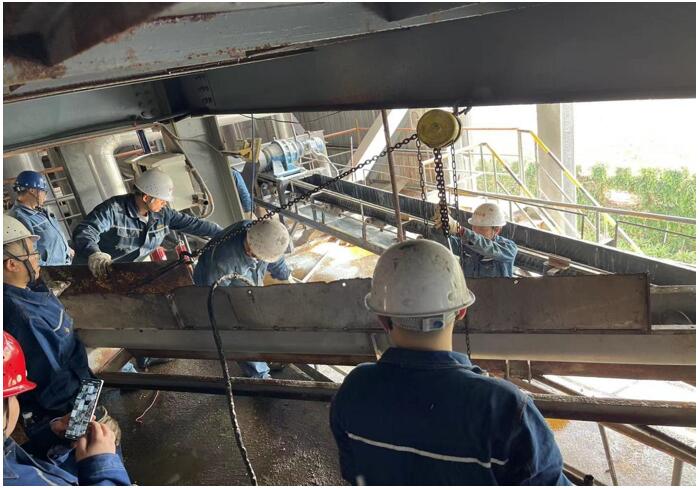 为更好解决后续物料输送压力,减少系统非计划停机,威远蓝鼎生产部决定将两条螺旋技改成输送皮带,10月30日,蒸发浓缩停机检修,副总经理黄安军、副部长杨平、宋雨鹏协同检修班长集中检修骨干对氯化钠螺旋进行技改,31日13:30螺旋改输送皮带技改完成进行试车,11月2日带料试车正常,经过一周使用观察,本次技改相比螺旋故障率更低,物料输送更松散、均匀,也大大改善了干燥前端下料堵塞等问题,同时也得到了钒厂运行车间的认可和生产员工一致好评,体现了公司敢于创新、技改的精神。
