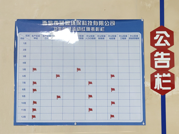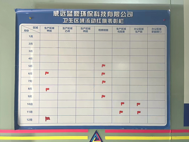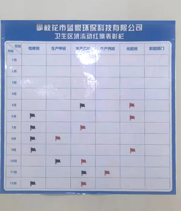 为促进工作环境卫生持续向好发展,2023年5月,集团为各公司做了卫生分区与责任划分,同时设立卫生流动红旗制度,以评估每个班组的卫生清洁情况。红旗代表该班组的本月卫生情况最好,黑旗则代表卫生情况不佳,需要整改。到12月底,攀蓝鼎、西昌蓝鼎、威远蓝鼎2023年度各个班组的卫生流动红旗评选结果已出炉。