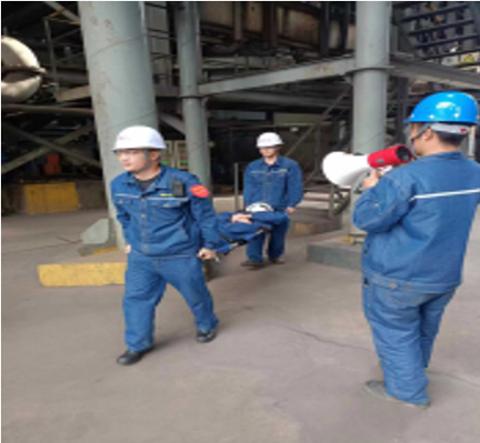 9:00大家集中在会议室召开演练方案会议并观看学习相关视频文件。学习结束后,事故演练人员将所需物资全数配备齐全,到达演练现场。演练开始前,烧结主任对此次演练的实际目的和教育意义进行了讲话。本次演练的是一名操作工不慎被旋转设备绞伤倒地,班组长立即带领应急抢救人员到达现场,将受伤人员用担架抬至安全区域,现场指挥员对受伤人员进行紧急抢救。