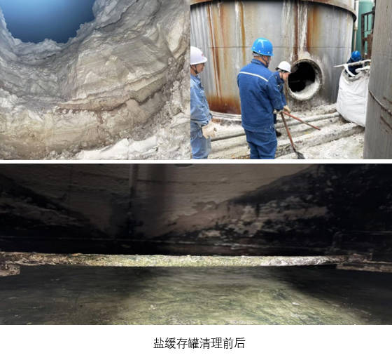 清垢现场,生产部安排专人对现场进行安全监督,生产班组除夜班值班,其余人员由刘贵明负责带领开展清理工作,清理现场严守安全规程,穿戴好劳动保护用品,配合专用工器具齐心协力清理顽固积盐,12月3日经过为期9天,大家一铲一撬的不懈奋战,盐缓存罐3米高的积盐成功见底,彻底清除。