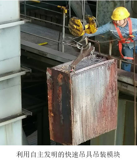 此次更换工作面临诸多挑战,特别是设备不能长时间停机,检修工作只能在间断的停机时间内进行。为此,检修团队提前自主设计并安装了检修用轨道梁、人孔门、电葫芦等辅助设施,还特别发明了专用吊具,实现了换热器模块的快速拆装。这一举措加快了检修速度,确保了检修质量,实现了零安全事故。