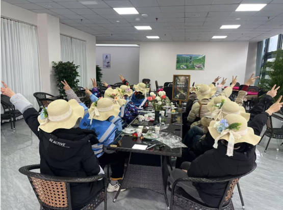 上午11时,创意手作环节在蓝鼎茶坊开展。现场备有纯色草帽及永生花、丝带等装饰材料,女员工们精心挑选花材,巧妙构思造型:有的将向日葵与康乃馨错落点缀成环形花冠,有的用丝带编织出立体蝴蝶结装饰。大家边制作边交流配色心得,互相挑选合适的花朵、协助粘贴花材。“通过团队协作完成作品,让我们感受到了自己动手创造带来的快乐。”一位参与者如是说。