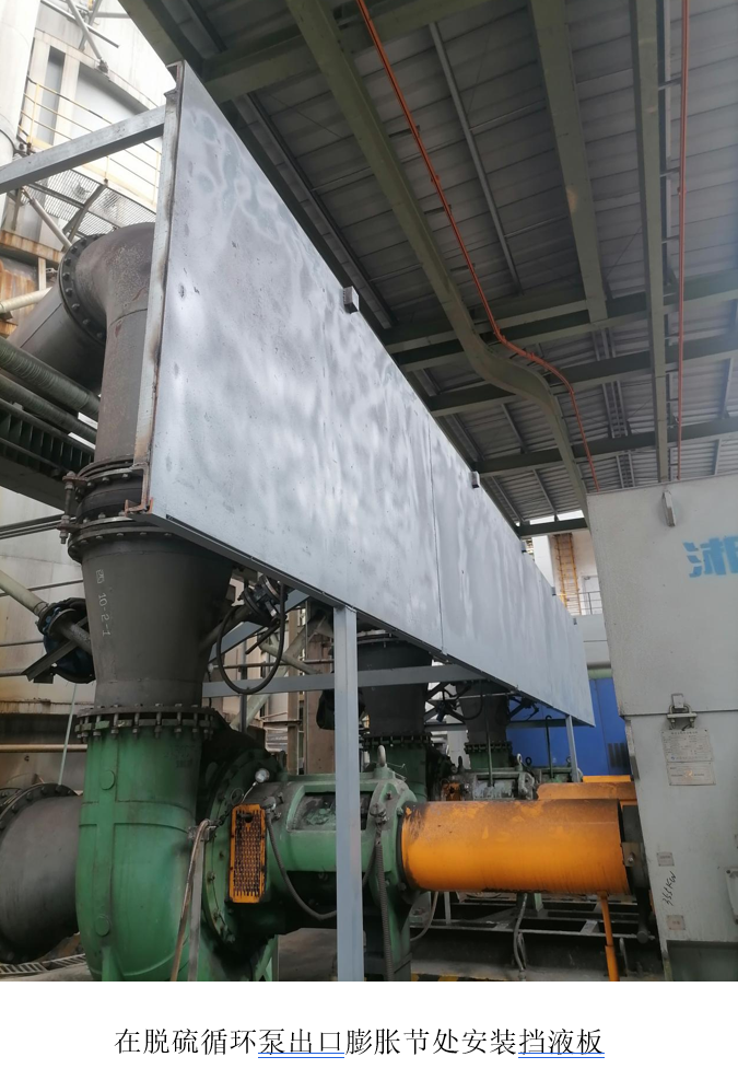 据相关技术人员介绍,原设计中脱硫循环泵出口膨胀节处未配备挡液板。在设备运行过程中,一旦膨胀节发生爆裂,溶液可能会喷溅到附近的高压电机,从而导致电机烧坏,不仅会造成设备损坏,还可能引发更严重的安全事故。为防患于未然,西昌蓝鼎副总经理高度重视,迅速组织专业团队进行技术研讨,并制定了详细的改造方案。