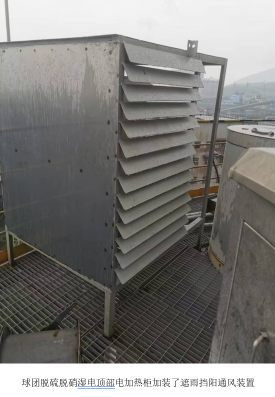 6 月 19 日,西昌蓝鼎球团脱硫脱硝项目迎来了重要技改,成功在湿电顶部电加热柜加装了遮雨挡阳通风装置。