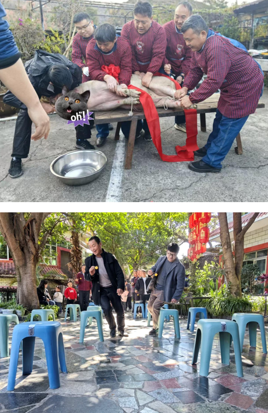 当日早上八点,活动在热闹的传统年俗仪式中拉开序幕。部分员工代表来到现场参与杀猪仪式,亲自体验了民俗流程,感受乡土文化中的协作与传承精神。这一环节不仅增添了活动的仪式感,也唤起了许多人对传统年俗的集体记忆。