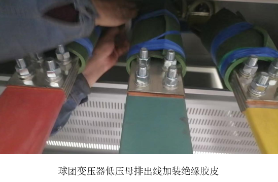 在球团主电脱硫区域,电气人员对顶部桥架盖板进行了全面加固,使用镀锌铁丝将所有盖板固定牢靠,防止大风天气下盖板脱落造成人员伤害或设备损坏。同时,对球团两台变压器低压出线母排加装绝缘胶皮,进一步提升绝缘防护等级,避免极端情况下因动稳定失衡引发母排短路事故。