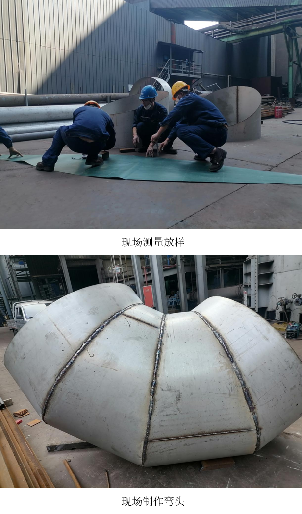 值得一提的是,这是西昌蓝鼎首次独立完成直径1.32米弯头制作全流程。面对不规则角度导致测量和放样难度大的问题,检修班长带领班员在没有专业放样设备的情况下,凭借扎实的几何计算功底和丰富现场经验,精准完成多角度弯头放样;焊接人员采用分段对称焊接工艺,有效控制不锈钢焊接变形,确保烟道系统密封性和使用寿命达到设计要求。